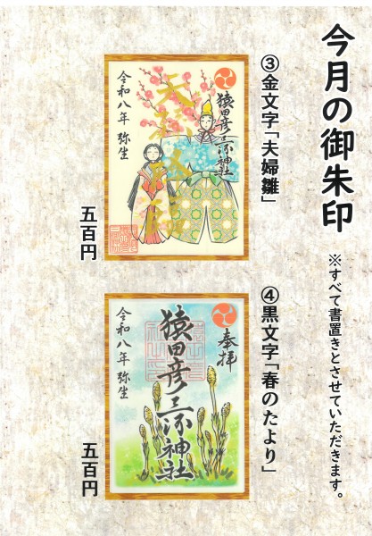 今月から新たに金箔を用いた見開きの御朱印④「猿田彦大神」を加えました。これまでの③「通常朱印」と同様に通年の御朱印としますが、こちらは書置きのみと致します。③「通常朱印」は直書きも致します。