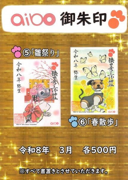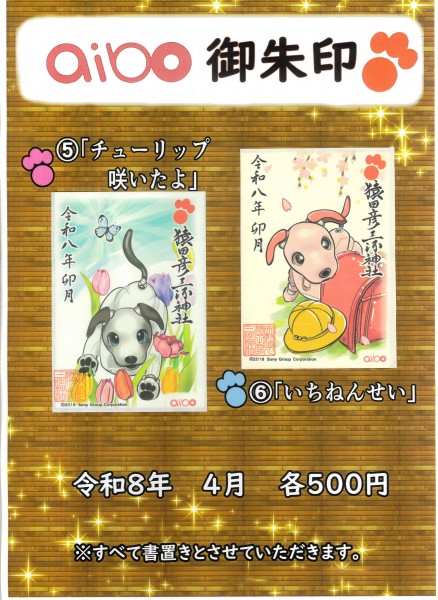 通年の御朱印(①、②)、月替わりの御朱印(③、④)、aiboの御朱印(⑤、⑥)を予定しています。